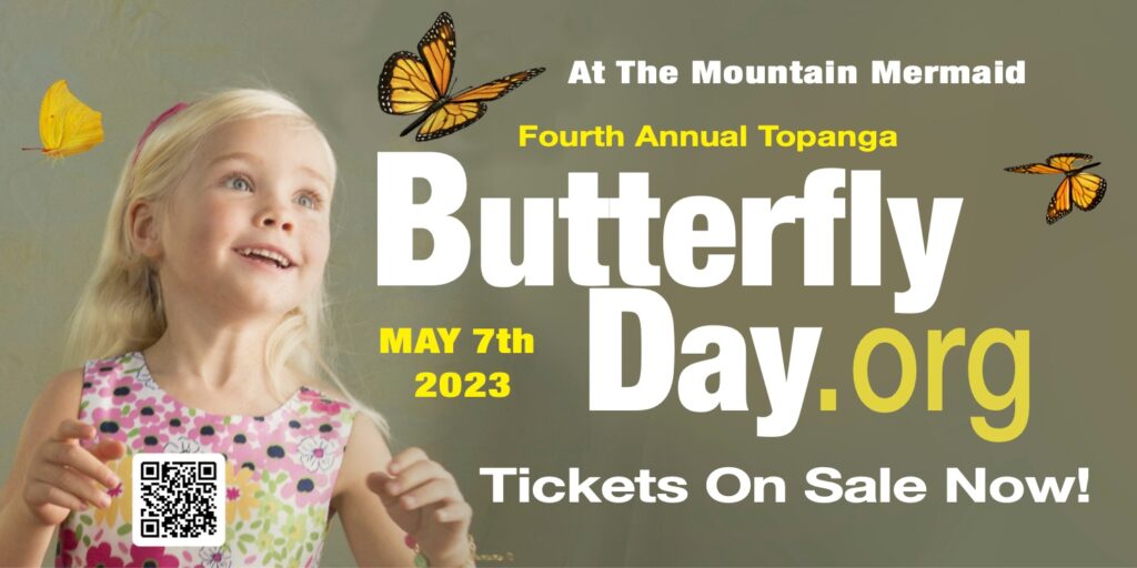 4th Annual Topanga Butterfly Day at The Mountain Mermaid is a community-sponsored, environmental action festival offering music, art, crafts, kids activities, eco-education exhibits, home-crafted healthy foods, native butterfly plants for sale, and hundreds of live butterflies in the amazing Mermaid Butterfly House. Join in on Sunday May 7th, 2023 with more than 20 environmental partners for a fun day of music, art, and education in the mountains of Topanga and support the goal of making Topanga and Malibu into the first-ever cities to become Certified Butterfly Habitats.